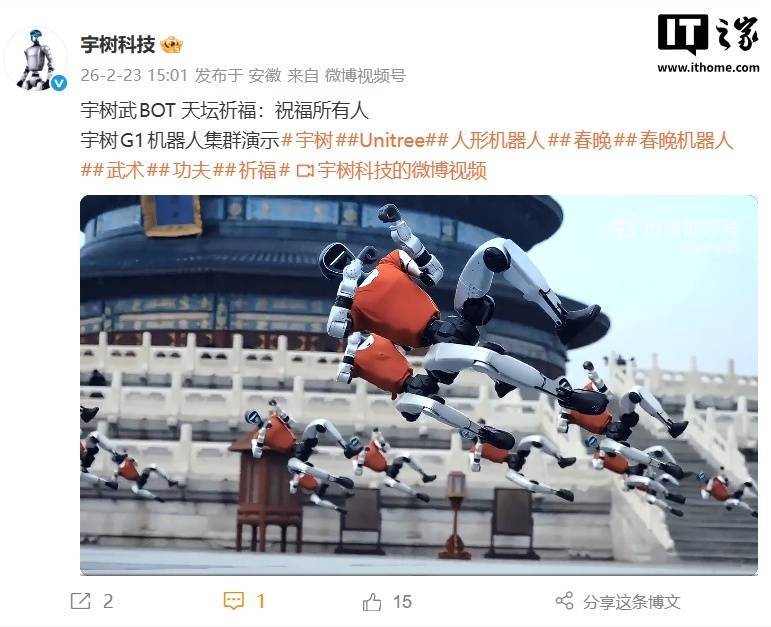 2 月 23 日消息,在 2026 年总台春晚舞台上,宇树机器人亮相《武 BOT》节目,大秀武术、跑酷,动作流畅程度可以说是惊艳全场。